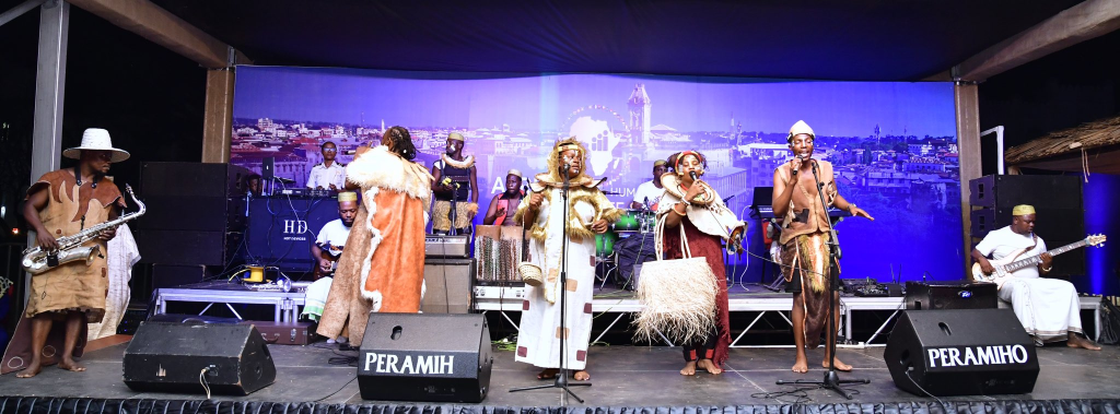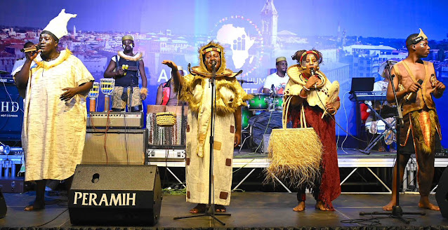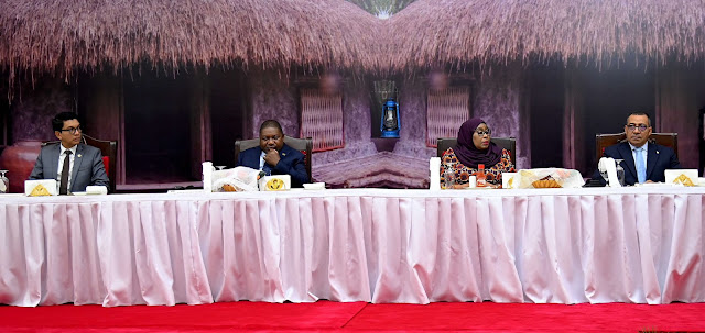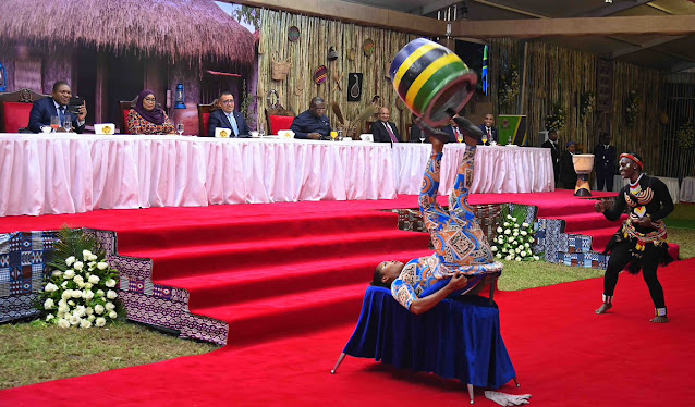 Rais wa Jamhuri ya Muungano wa Tanzania Mhe. Samia Suluhu Hassan akiwa na wageni wake Rais wa Msumbiji Mhe. Filipe Nyusi, Rais wa São Tomé na Principe Mhe. Carlos Vila Nova, Rais wa Madagascar Mhe. Andry Nirina Rajoelina pamoja na Rais wa Sierra Leone Mhe. Julius Maada Biowakati wakiangalia vikundi mbalimbali vikitumbuiza katika hafla ya Chakula cha jioni alichowaandalia viongozi wanaoshiriki Mkutano wa Wakuu wa Nchi za Afrika kuhusu Rasilimali Watu, Ikulu Jijini Dar es Salaam tarehe 25 Julai, 2023.