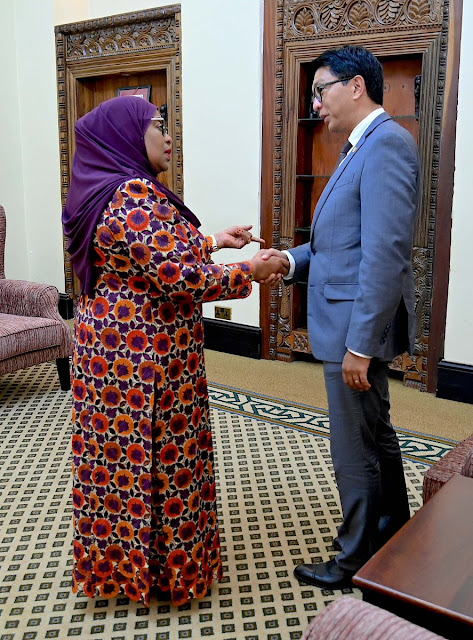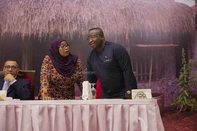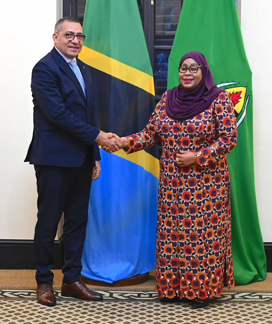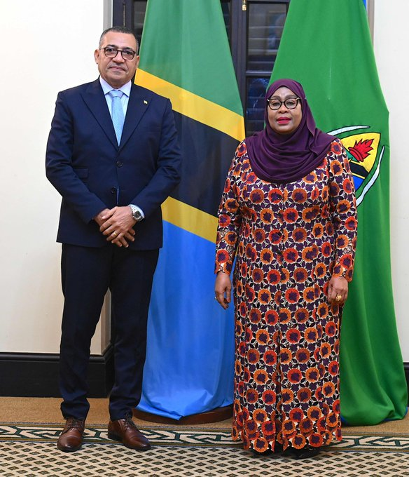 Rais wa Jamhuri ya Muungano wa Tanzania Mhe. Samia Suluhu Hassan akiwa kwenye picha ya pamoja na Rais wa São Tomé na Principe Mhe. Carlos Vila Nova Ikulu Jijini Dar es Salaam tarehe 25 Julai, 2023.