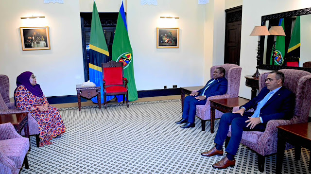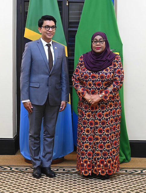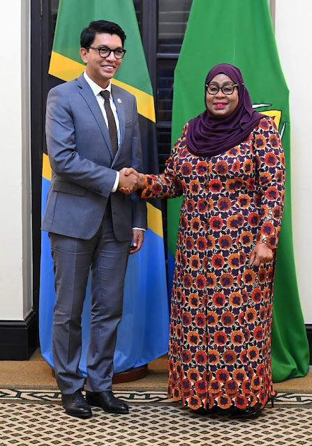 Rais wa Jamhuri ya Muungano wa Tanzania Mhe. Samia Suluhu Hassan akiwa kwenye picha ya pamoja na Rais wa Madagascar Mhe. Andry Nirina Rajoelina, Ikulu Jijini Dar es Salaam tarehe 25 Julai, 2023.