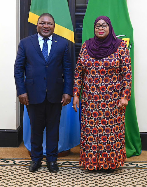 Rais wa Jamhuri ya Muungano wa Tanzania Mhe. Samia Suluhu Hassan akiwa kwenye picha ya pamoja na Rais wa Msumbiji Filipe Nyusi Ikulu Jijini Dar es Salaam tarehe tarehe 25 Julai, 2023.