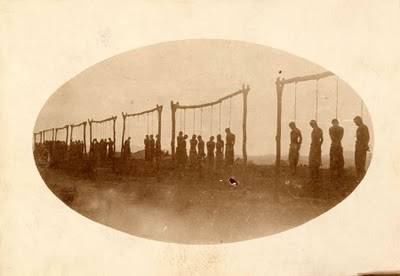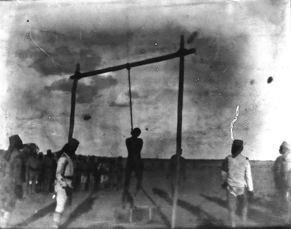 “Basi waliwafunga wafungwa wanne toka mnyororo ule mkubwa na wakawasimamisha juu ya ule ubao uliotegeshwa,wakawapachika zile kamba zilizoning’inia,kila mmoja na kamba yake huku wakiwa wamefungwa kamba mikono yote miwili ili wasiweze kujimudu na nyuso zao zilikuwa zimefungwa vitambaa vyekundu ili wasiweze kuona”,anasisitiza Gama.